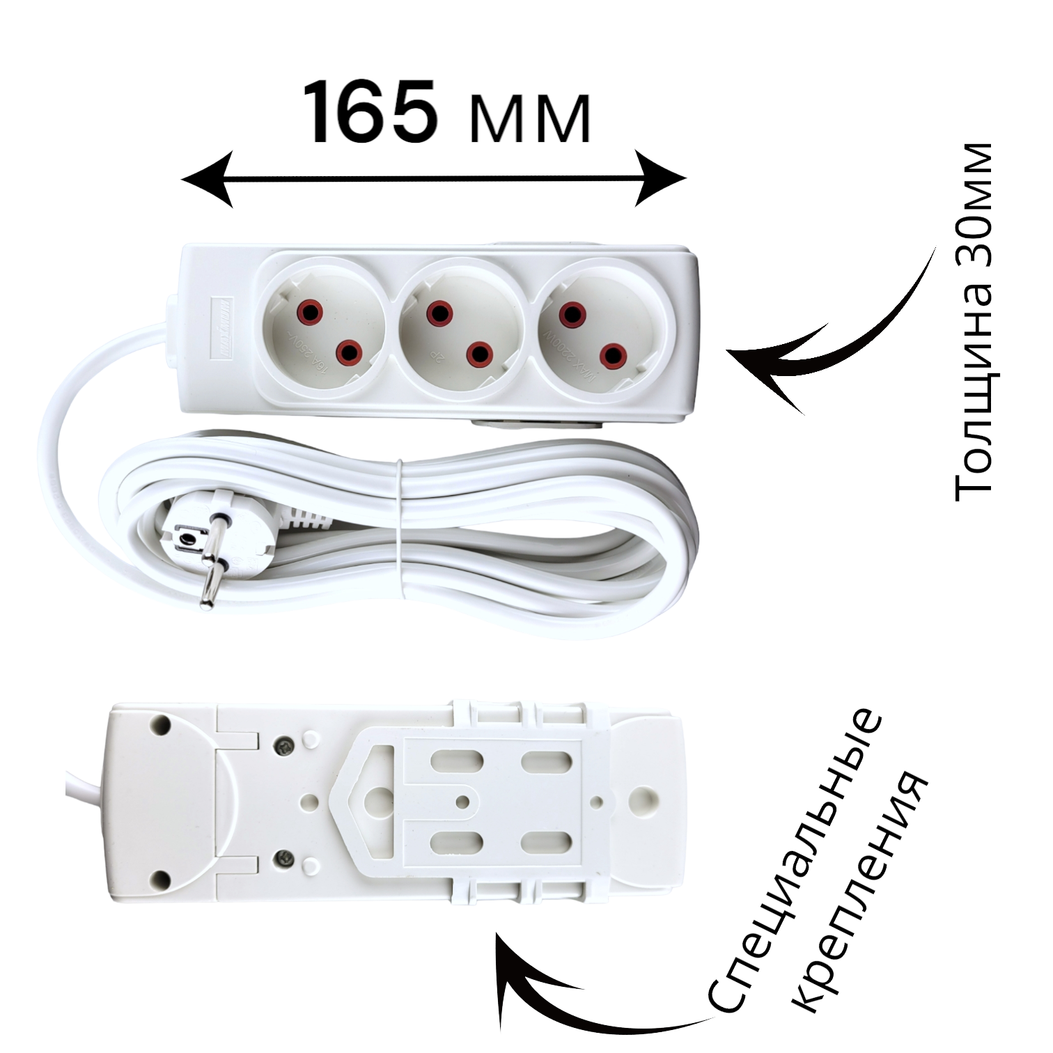 Бытовой электрический удлинитель 3 метра от "MAXIMUM QUALITY TOOLS" рассчитан на подключение к сети переменного тока от одного до трех приборов одновременно. Белый корпус из негорючего АБС-пластика оборудован тремя утопленными розетками типа «евростандарт». Удлинитель подходит для использования только внутри помещений. На тыльной стороне создано крепление для подвеса. Номинальное напряжение 220 В, номинальный ток 16 А, степень защиты от пыли и воды IP 20. Длина корпуса 165 мм.